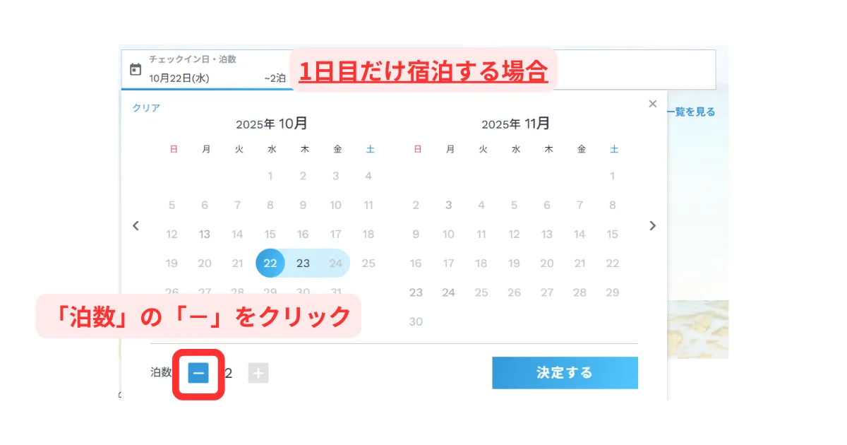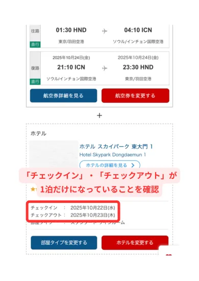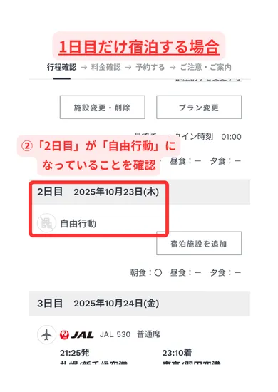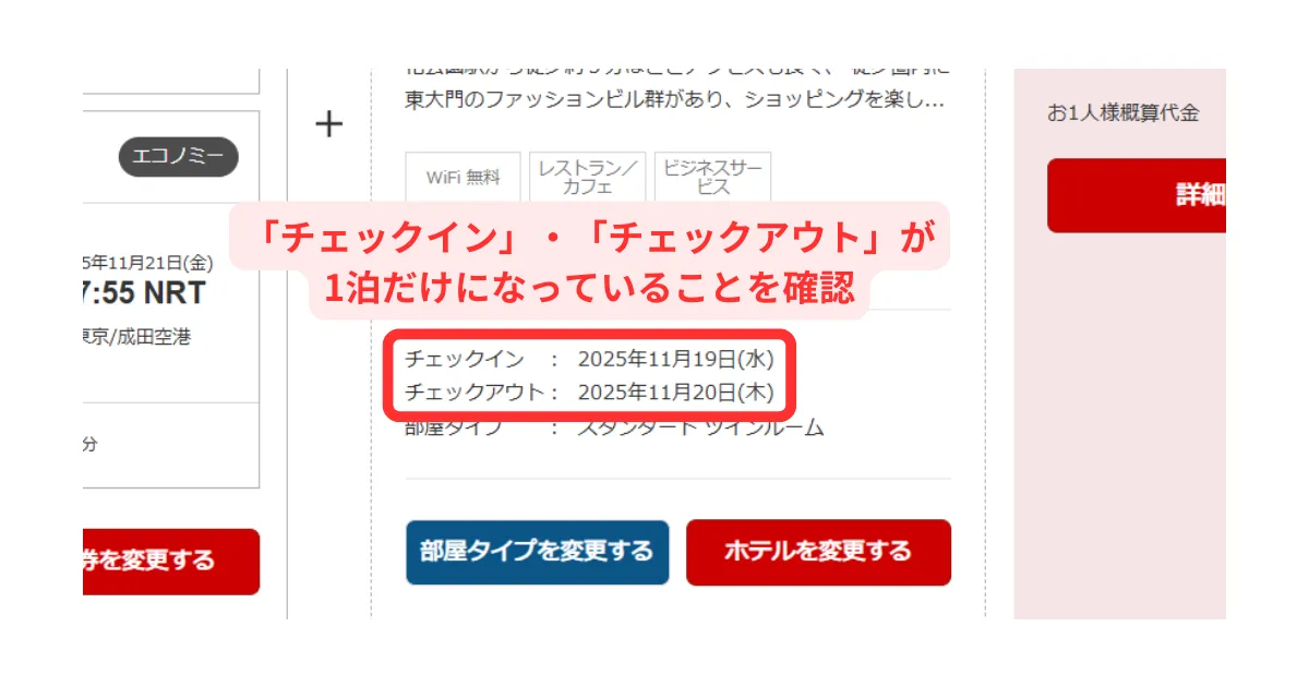 「選択中の航空券+ホテル」の「チェックイン」・「チェックアウト」が1泊だけになっていることを確認