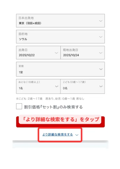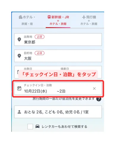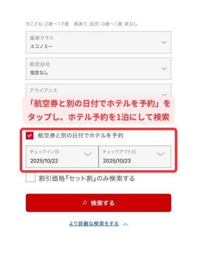 「航空券と別の日付でホテルを予約」をタップし、ホテル予約を1泊にして検索