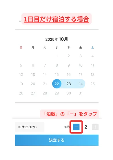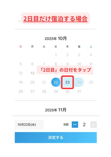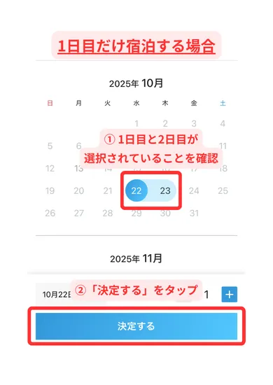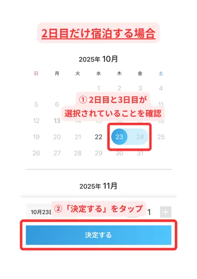 1日目と2日目が選択されていることを確認し、「決定する」をタップ