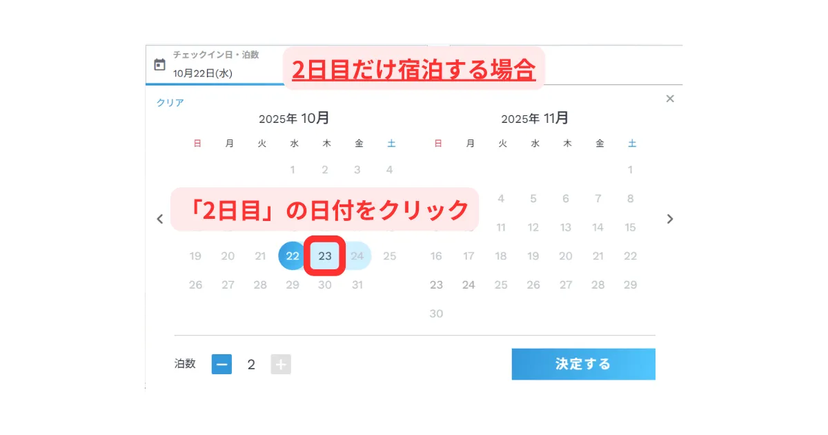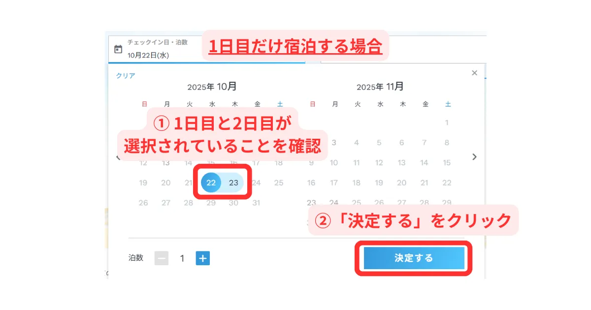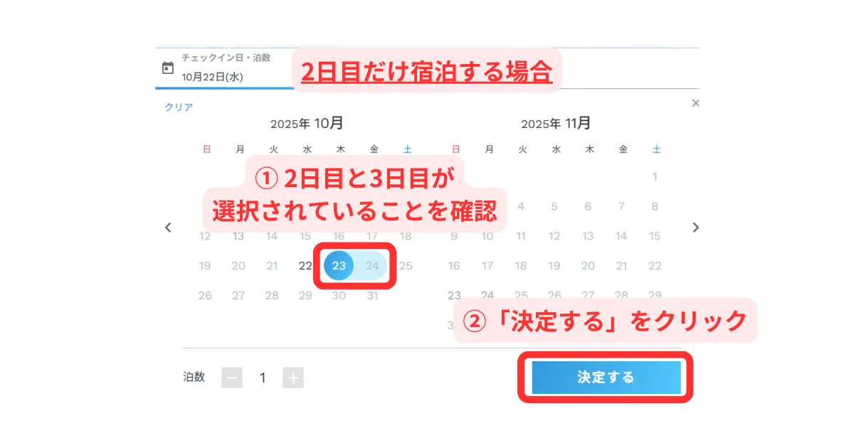 1日目と2日目が選択されていることを確認し、「決定する」をクリック
