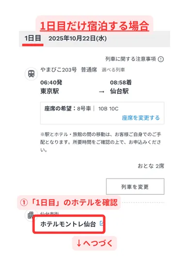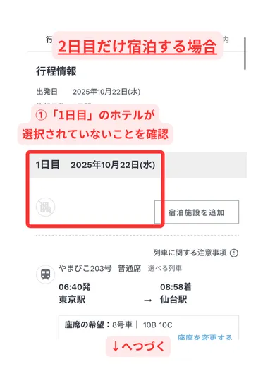 通常どおり検索し、1日目のホテルと新幹線または飛行機を選択し、「選択内容確認」ページまで進みます。