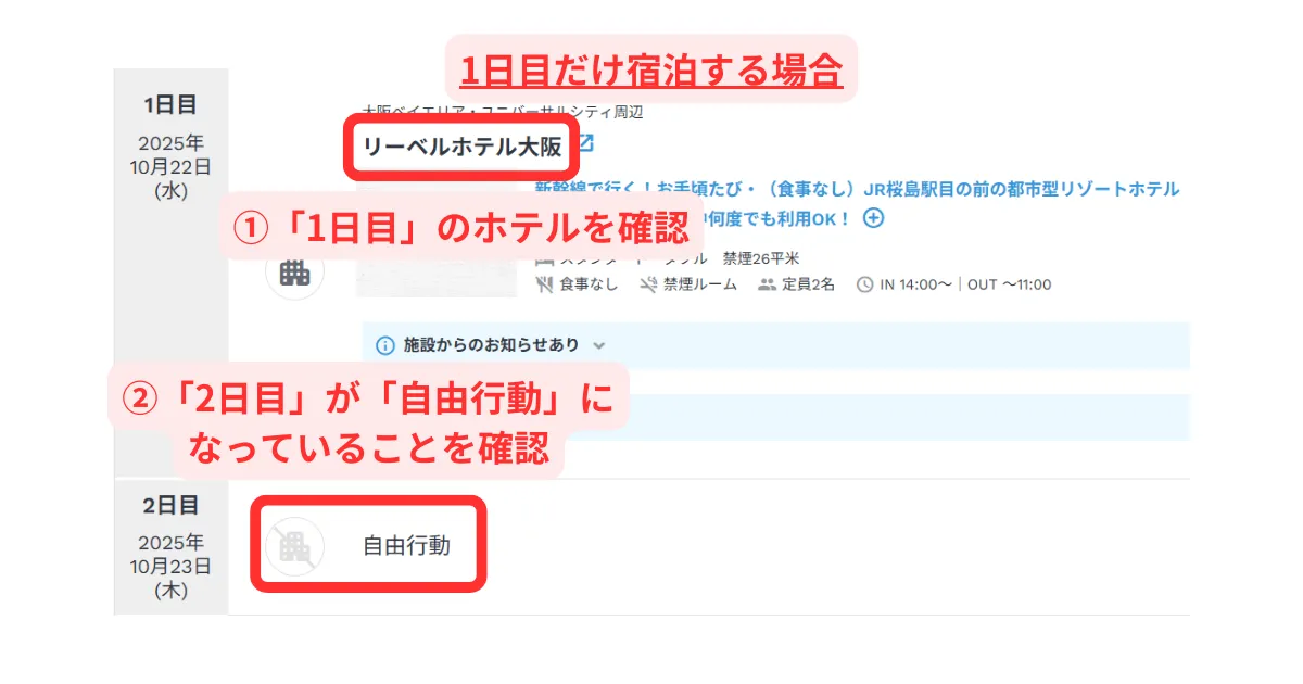 1泊3日の場合、宿泊は1日目だけ、または2日目だけの2パターンあります。