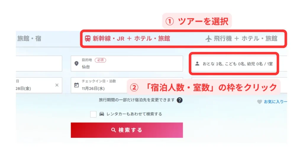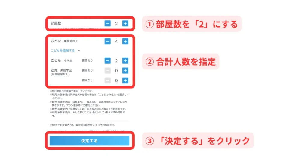 - 国内新幹線+ホテル:1回の予約で最大7部屋、最大9名まで 3・4