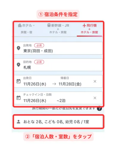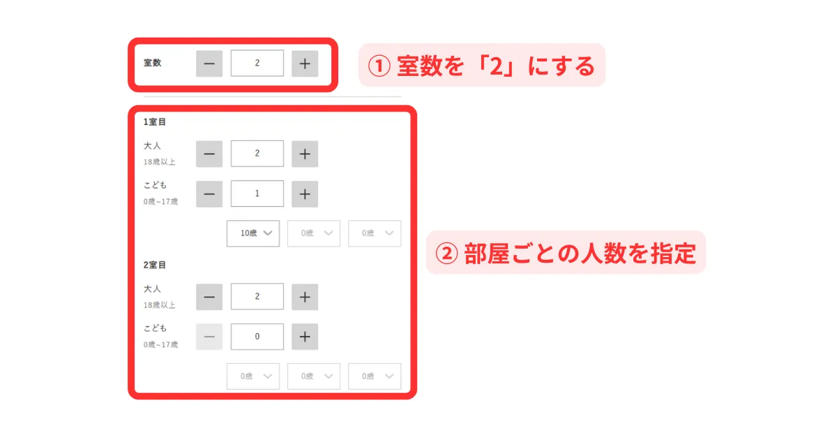 - 2部屋とも同じホテル・プラン・宿泊日でなければならない