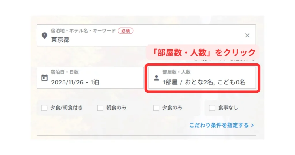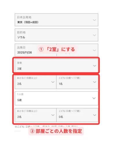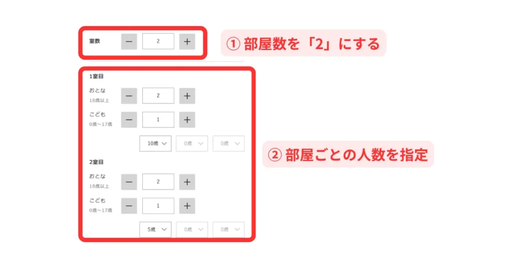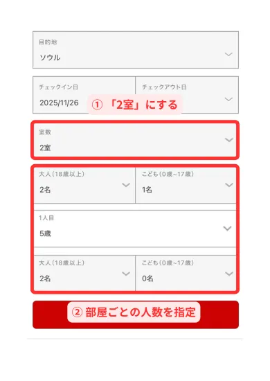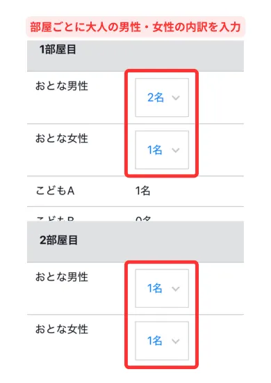 2部屋とも同じホテル・プラン・宿泊日でなければならない
