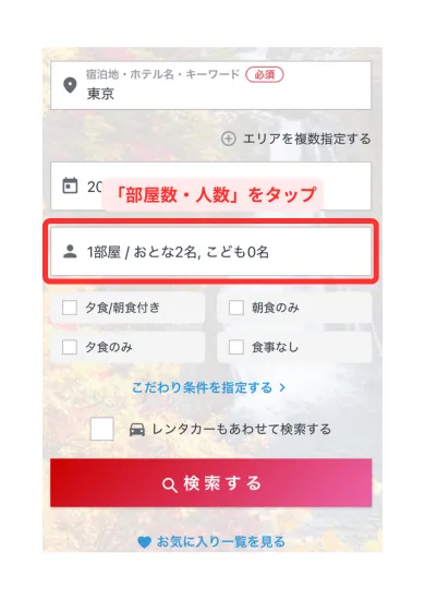 - 国内航空券+ホテル:1回の予約で最大6部屋、最大6名まで 5・6