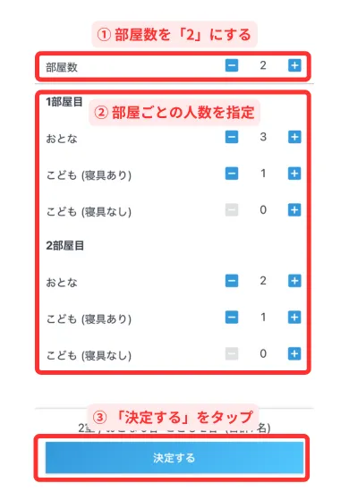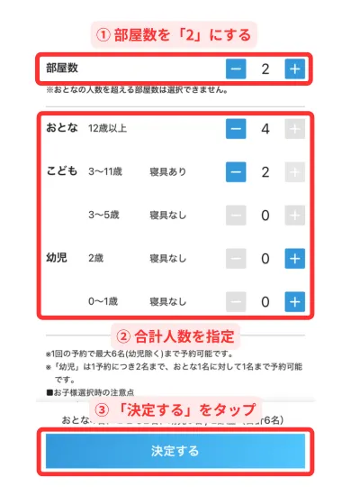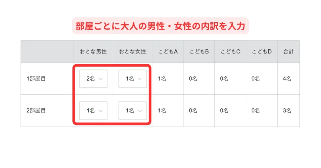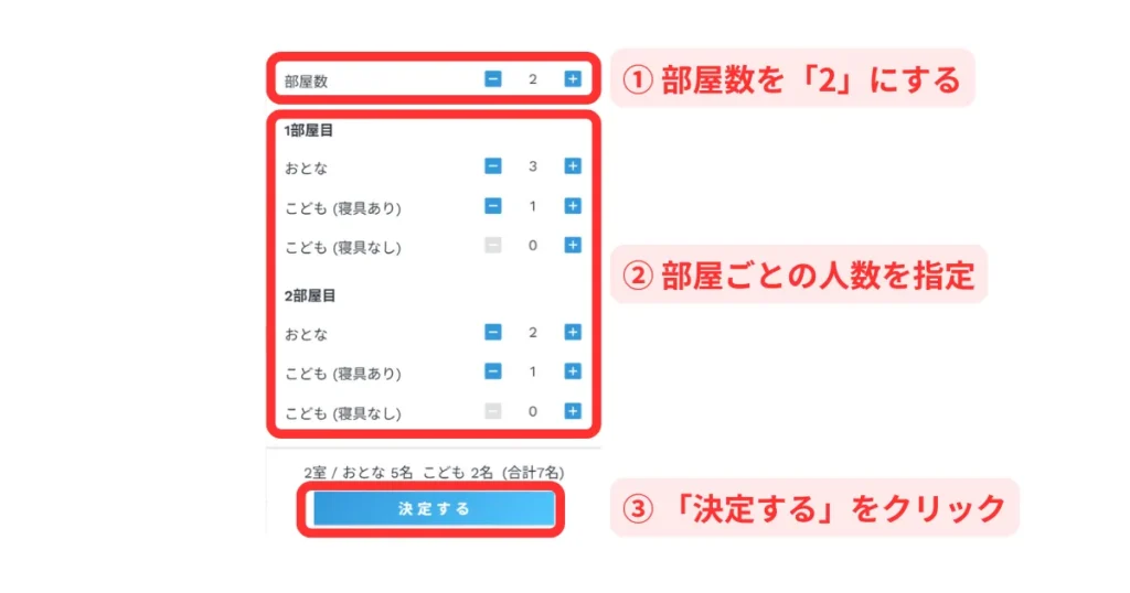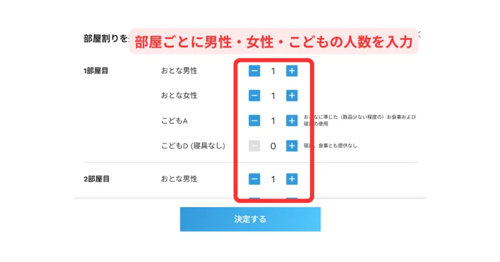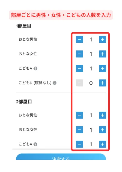 - 商品によって一度に予約可能な部屋数・最大宿泊者数が異なる