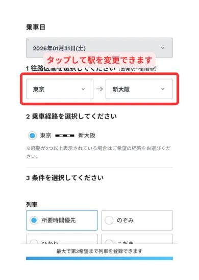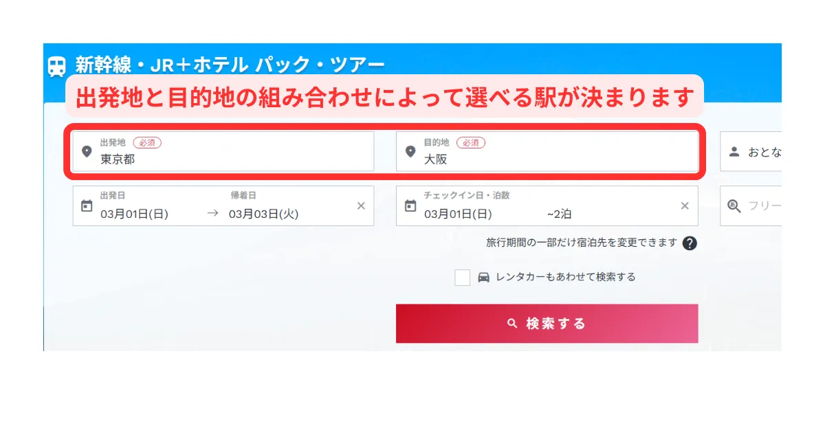 JTB の新幹線パックは旅程条件で最初に入力する出発地・目的地周辺の駅が指定可能です。