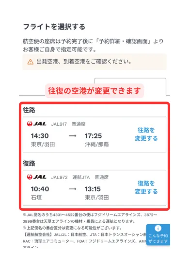 行きの到着空港と帰りの出発空港は全国から選択可能
