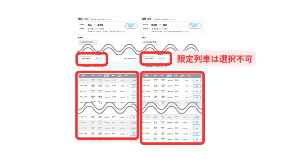 「東京 ⇔ 大阪」の国内ツアーの場合、限定列車は選択不可(そもそも選べない)でした。