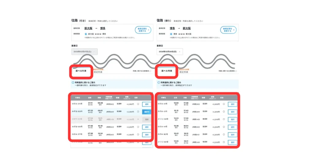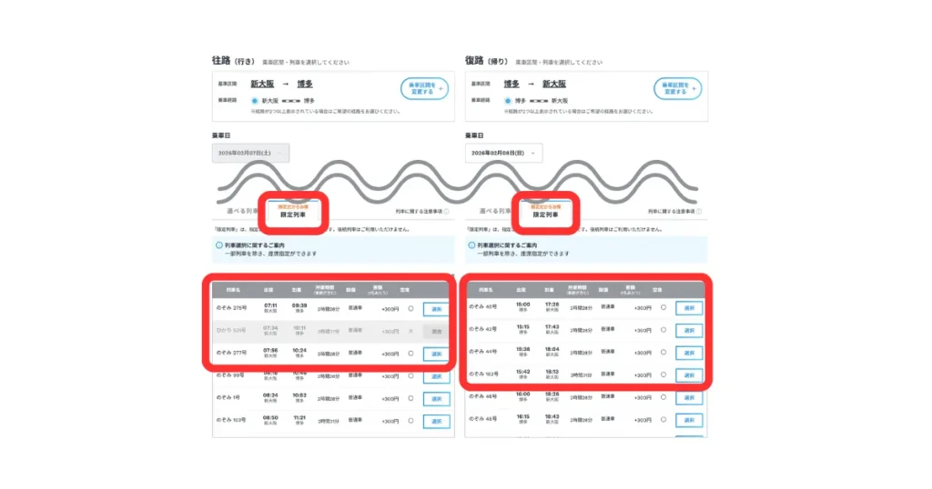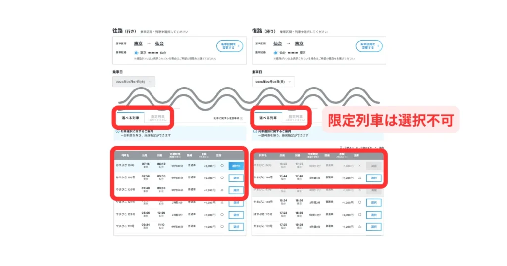 「限定列車」は「選べる列車」より基本的に安く設定されています。