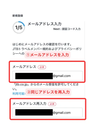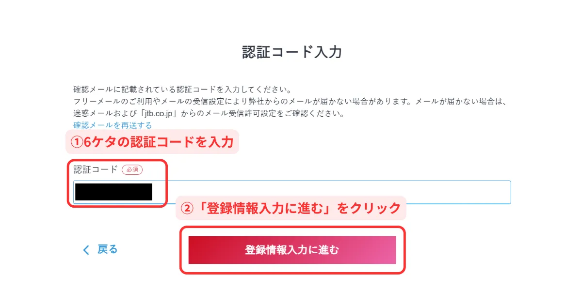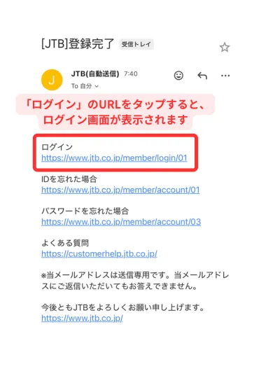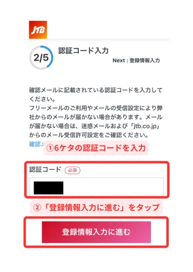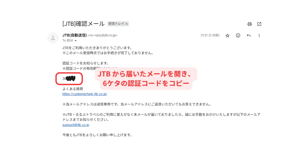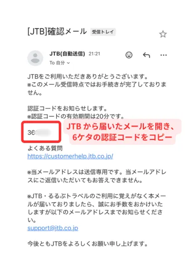JTBから届いたメールを開き、6ケタの認証コードをコピー