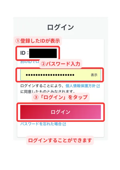 「ログイン」のURLをタップすると、ログイン画面が表示されます