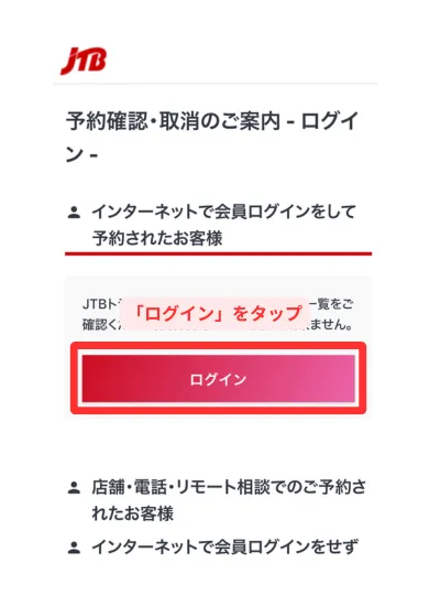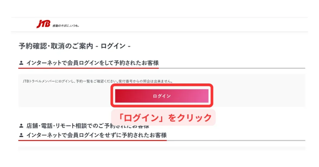 ※ ログインせずに予約した方は 予約確認画面 から「受付番号」と「代表者の電話番号」を入力して手続きしてください。