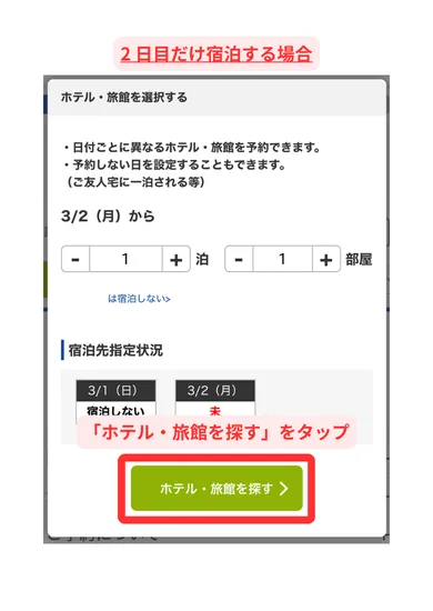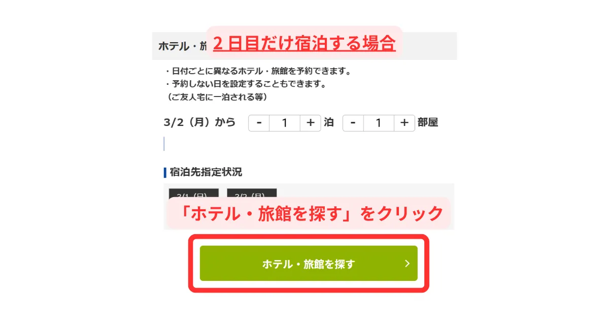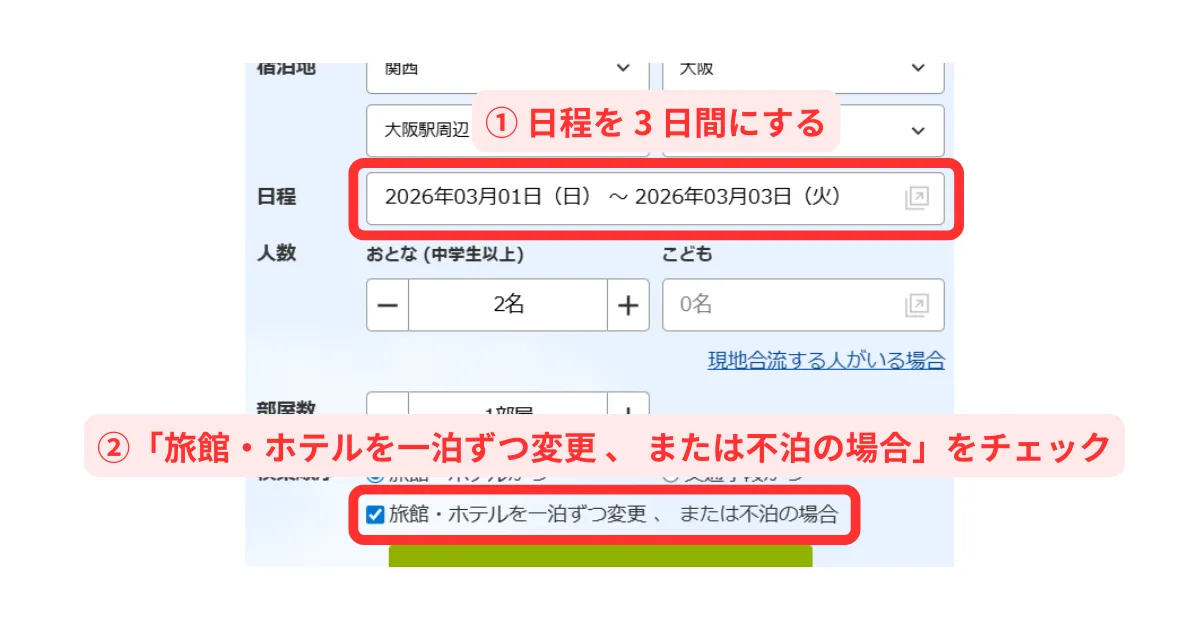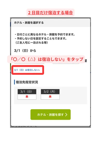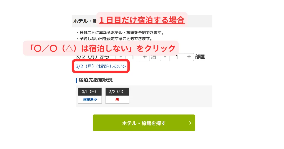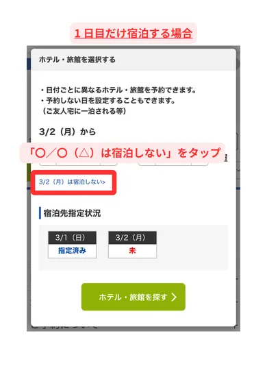 2. 旅館・ホテルを一泊ずつ変更 または不泊の場合」にチェック