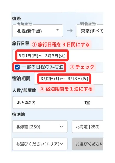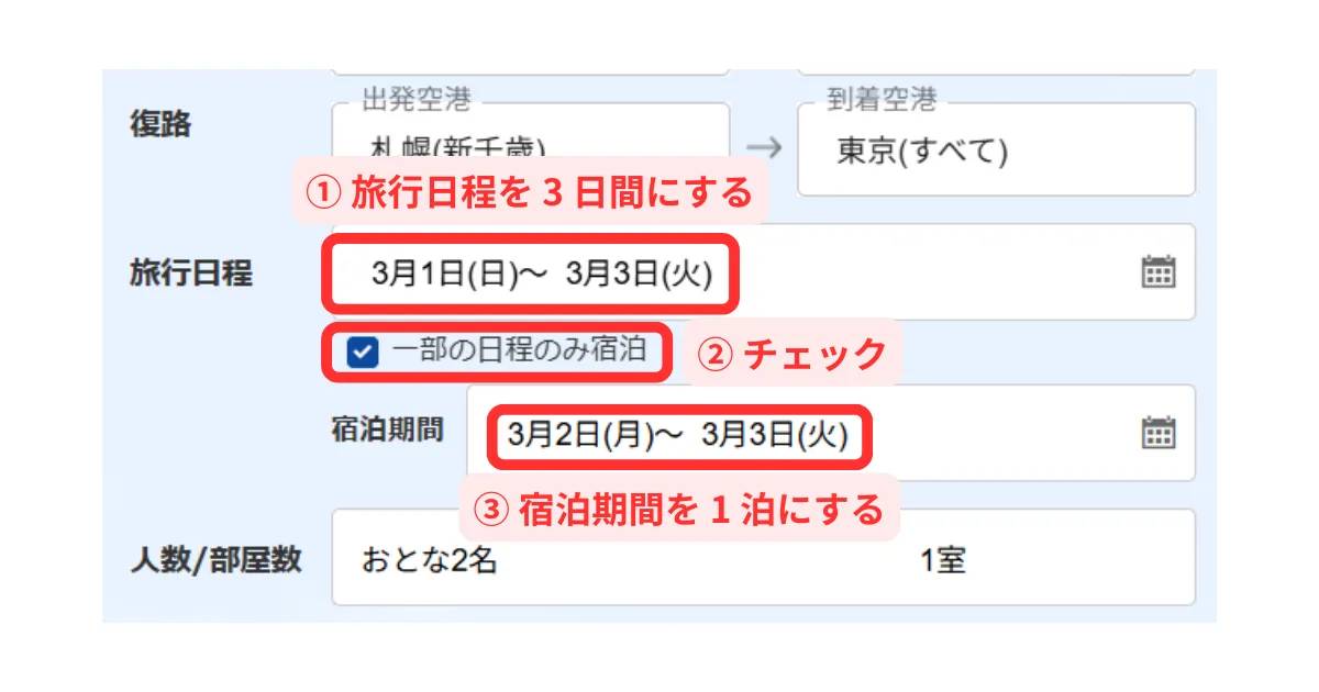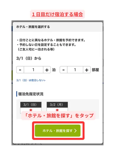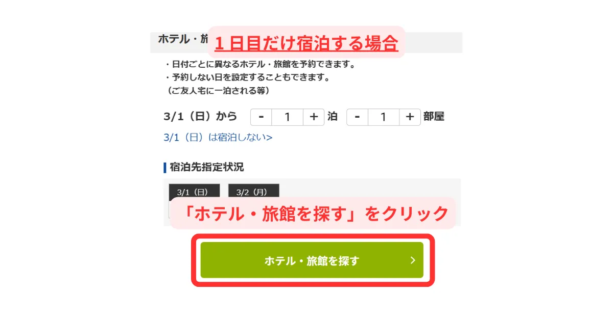 1 泊 3 日の場合、宿泊は 1 日目だけ、または 2 日目だけの 2 パターンあります。