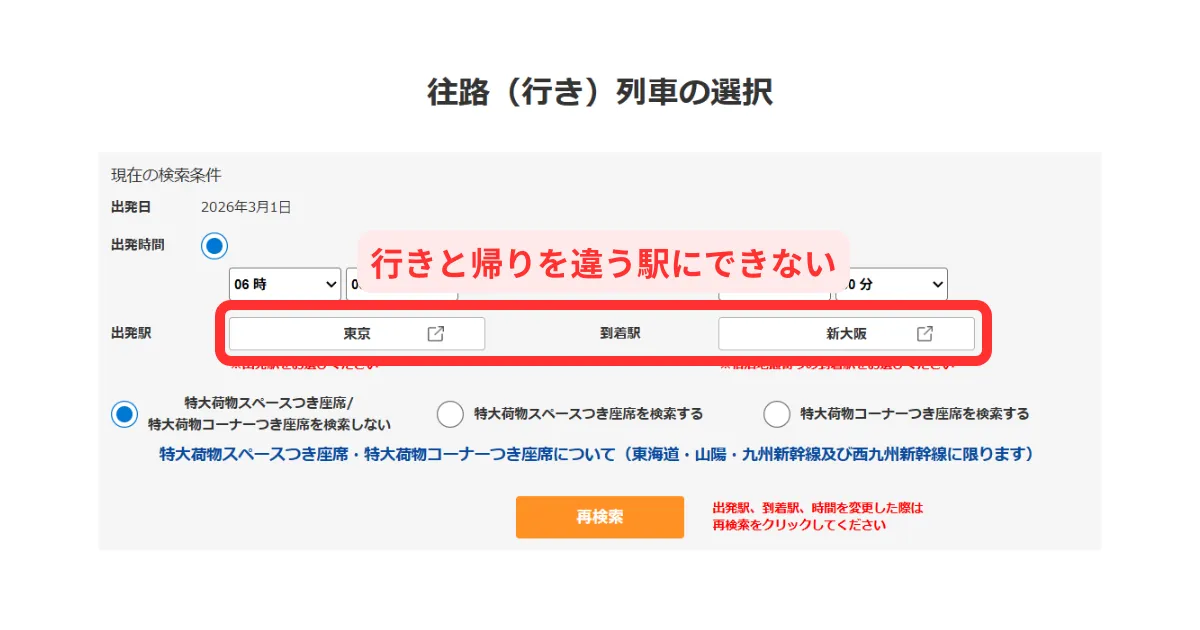 商品によって対応可能の場合もあるようですが、インターネットからは行きと帰りを違う駅にすることはできません。4