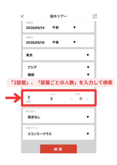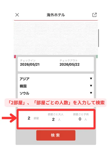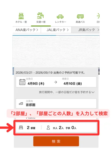 - 検索条件を「2部屋」にすることで予約可能