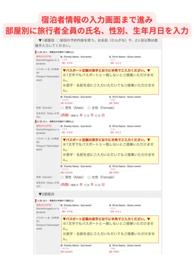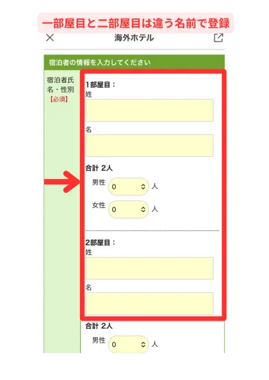 国内ホテルの予約は一部屋目と二部屋目を違う名前で予約しなければいけません。14