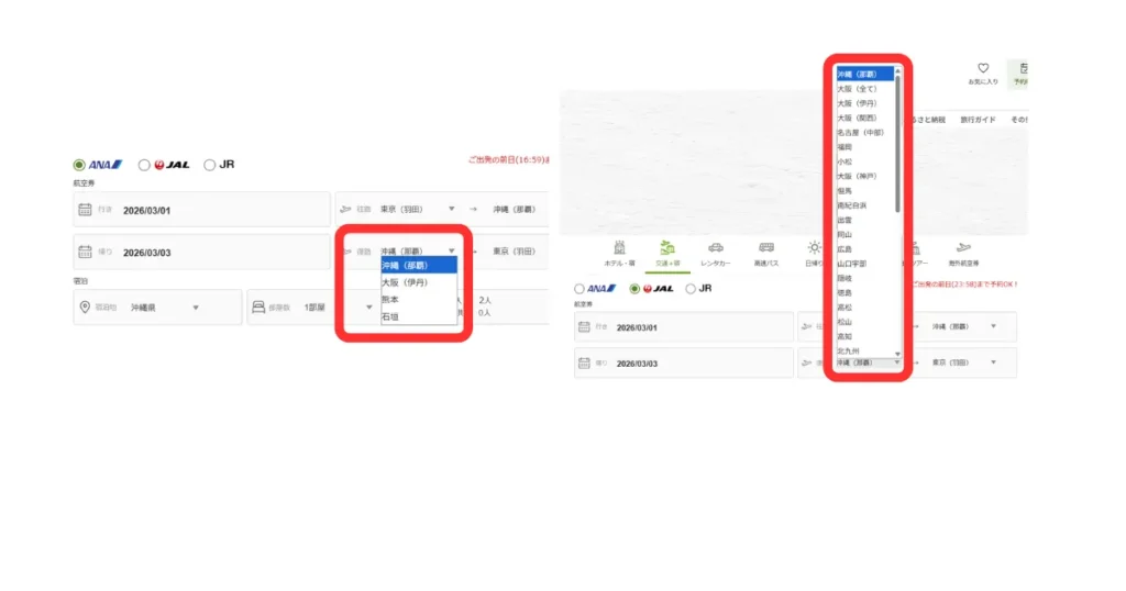 楽天トラベルの国内飛行機パックで行きと帰りの空港を変える方法