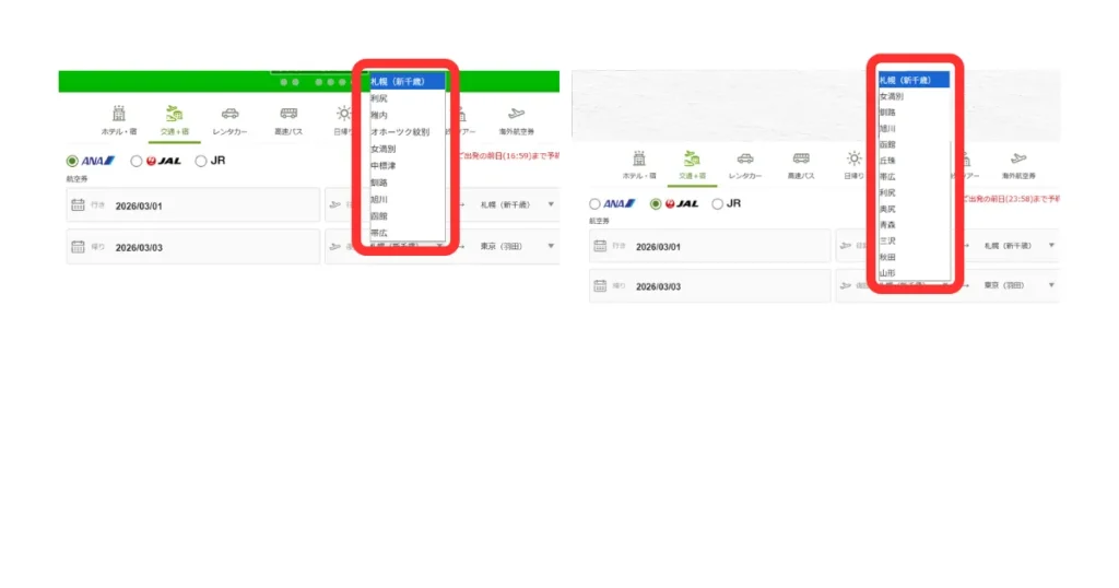 • ANA と JAL では選べる空港が異なる