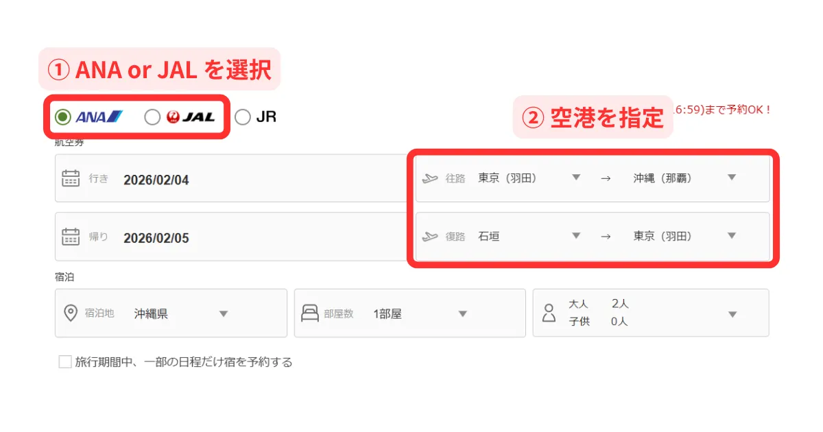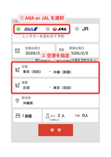 ①往路出発:東京(羽田空港)、往路到着:沖縄(那覇空港)