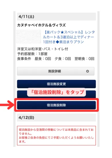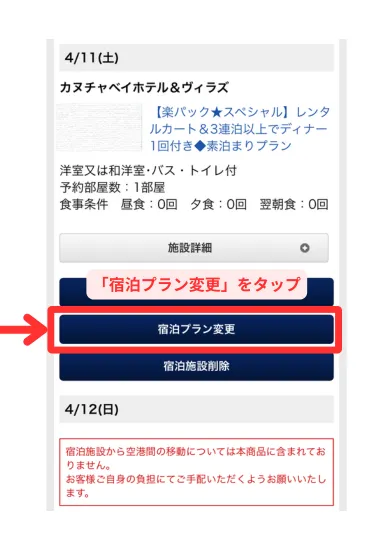 選択内容確認画面の「宿泊プラン変更」から2日目を同じホテルの違うプランに変更できます。