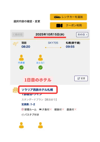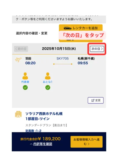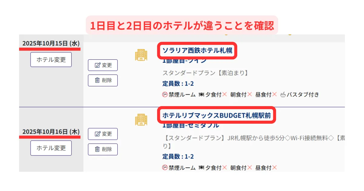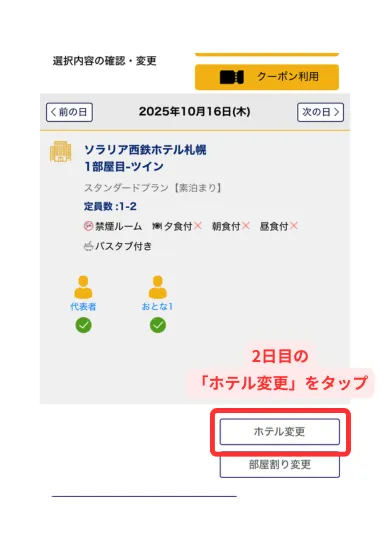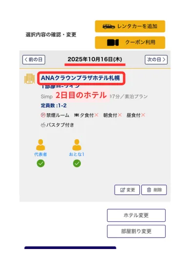 2日目のホテルを選択し、「選択内容の確認・変更」のページまで進みます。