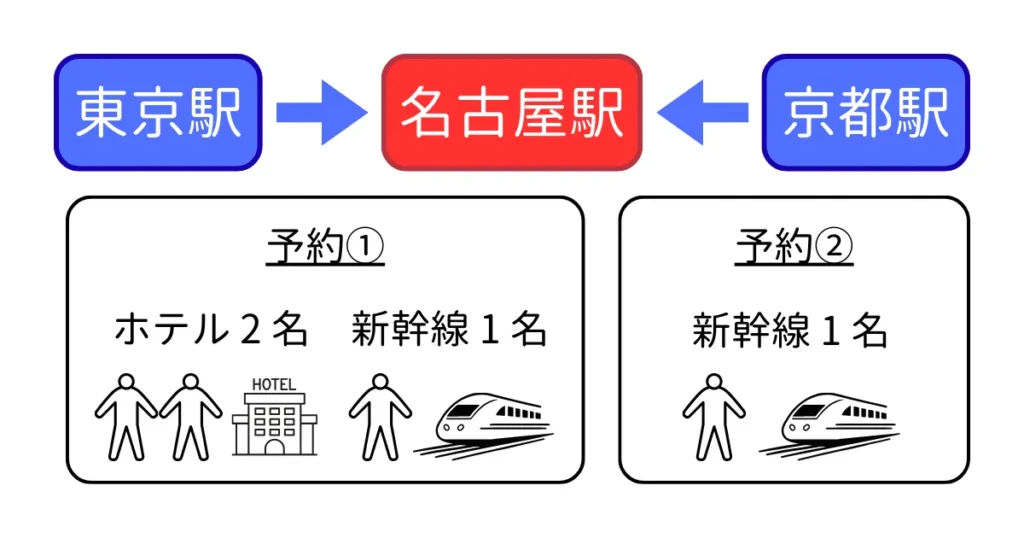 出発駅の違う新幹線チケット(上記でいう予約②)は別途購入しなければいけませんが、友人や家族と出発地が違う場合はこのような予約ができます。