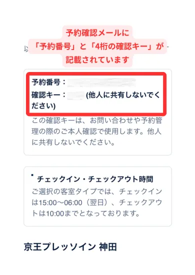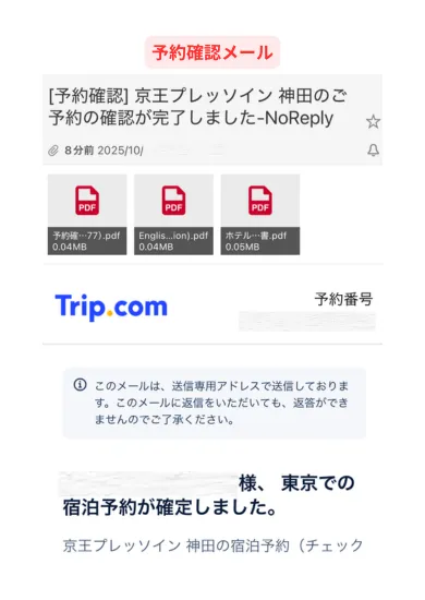 Trip.comで予約を完了させると届く「予約確認メール」に、それぞれ記載されています。