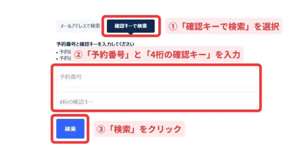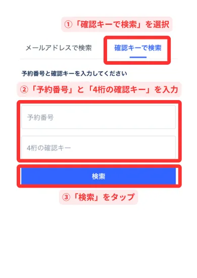 PINコードで検索する場合は、「予約番号」と「4桁の確認キー」が必要です。