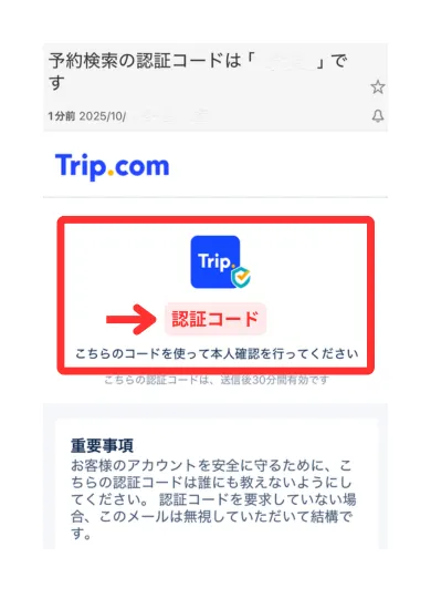 【Trip.comの予約検索の認証コードが記載されたメール】