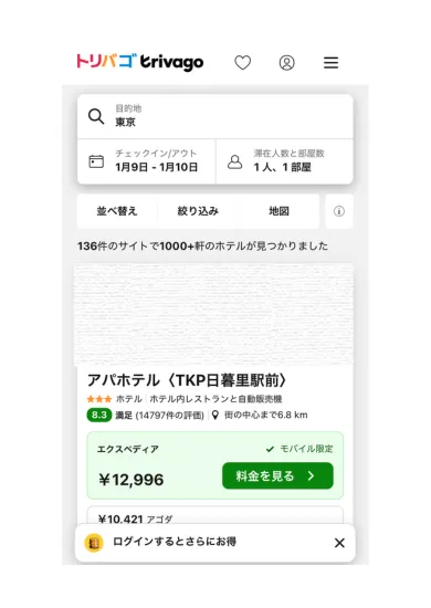 トリバゴは提携先の宿泊予約サイトのプランが表示されており、予約は別サイトへ移動する必要があります。