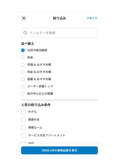 | 絞込 | ![]() 出典:トリバゴ 料金 ユーザー評価 ホテルの評価 施設タイプ 人気観光スポット 特定の住所 街の中心までの距離 支払い 食事のオプション すべての設備/サービス スタイル 次の旅行者に人気 バリアフリー 家族向けアクティビティ スマートフィルター | ![]() 出典:アゴダ 料金 星の数 くちコミ評価 お支払いプラン 市内中心地までの距離 プラン特典・サービス 設備・サービス 客室設備 ベッドルーム数 ベッドタイプ エリア ロケーション評価 周辺の人気アトラクション 宿泊施設タイプ キーワード |
