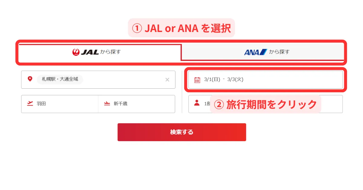 JAL or ANA を選択し、旅行期間を 3 日間にして検索
