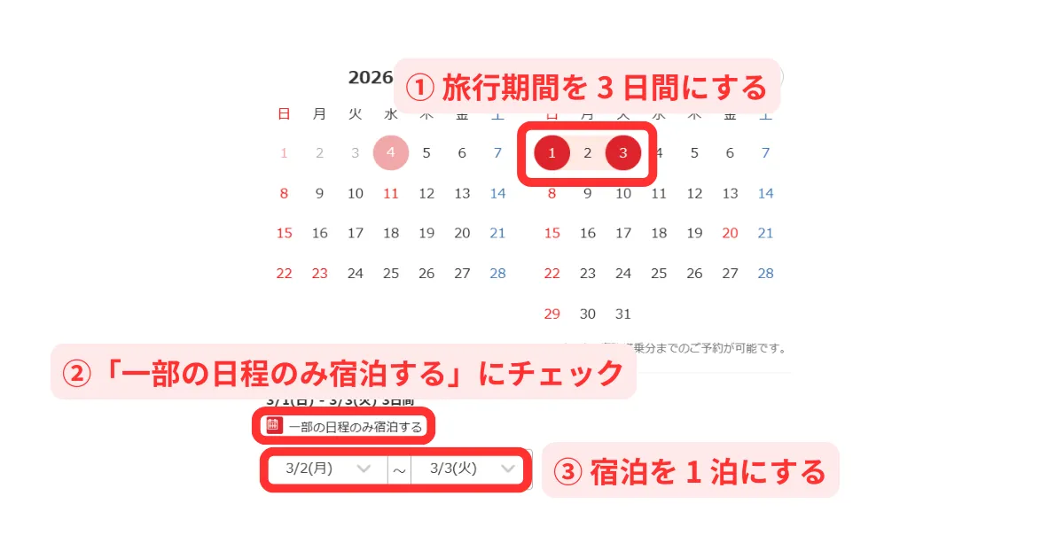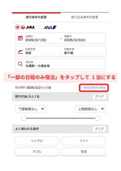 「一部の日程のみ宿泊」をタップして 1 泊にする