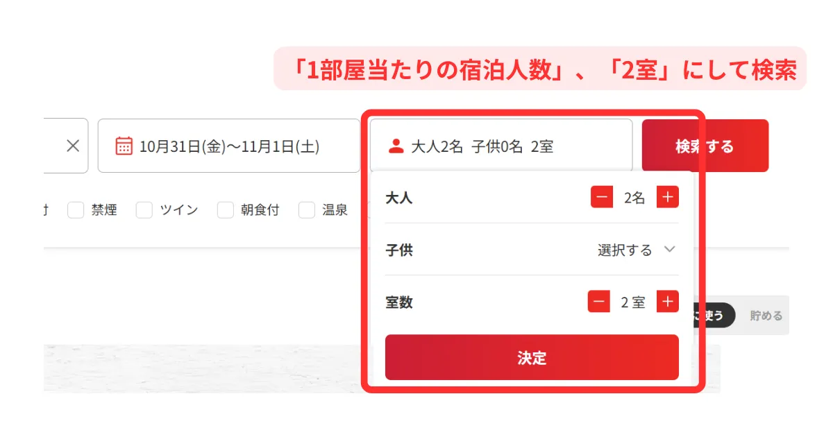 - スマホ版では部屋ごとに異なる宿泊人数を設定できないため、PC版での操作が必要