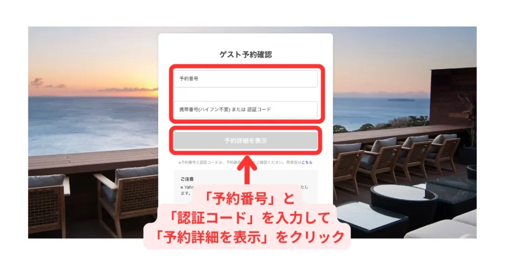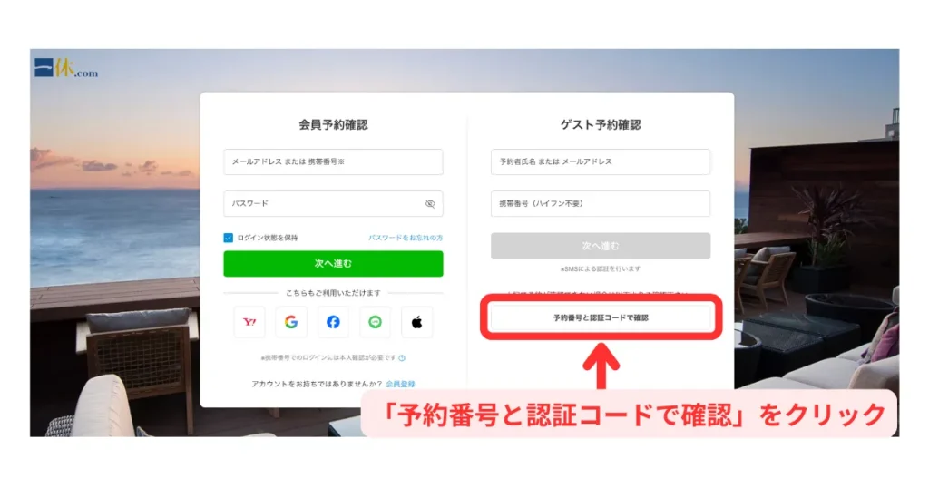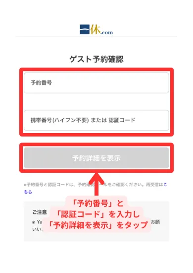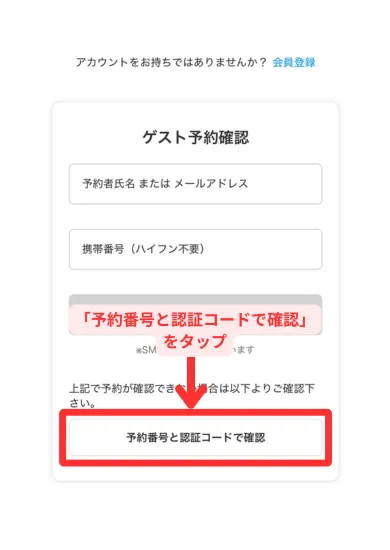 - ゲスト予約>スマホ(Web)>「予約番号」と「認証コード」で確認する