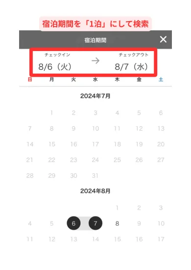 たとえば、東京で2泊するときの予約手順は以下の通りです。