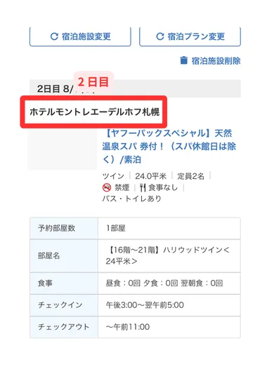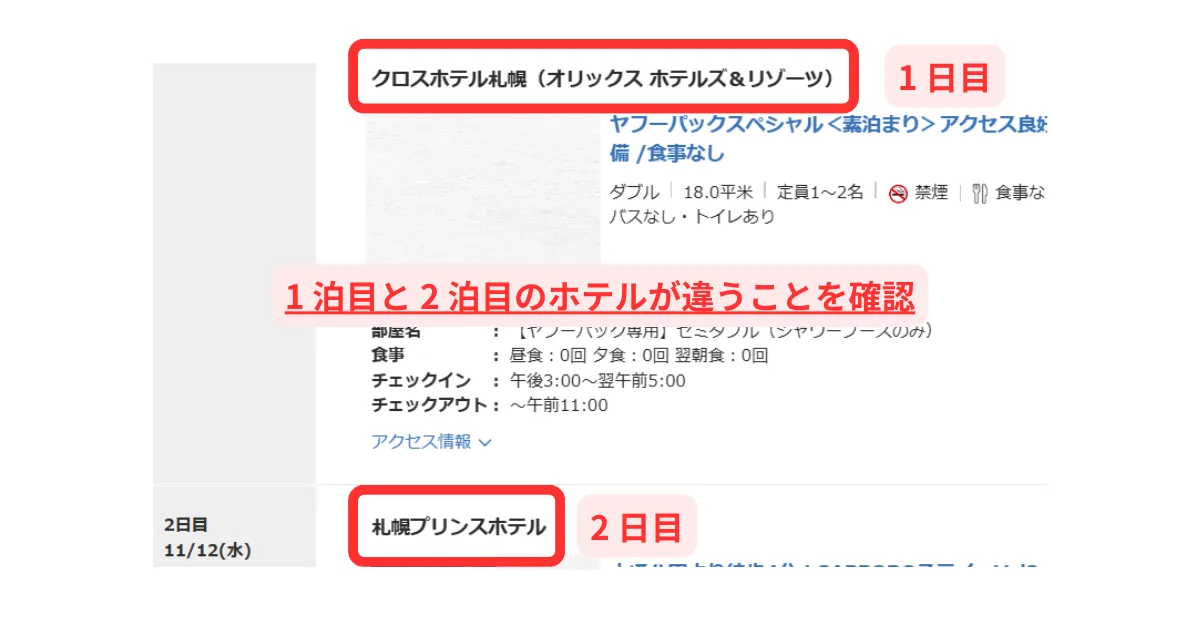 1 泊目と 2 泊目を違うホテルにするときの注意点はつぎの記事をご覧ください。